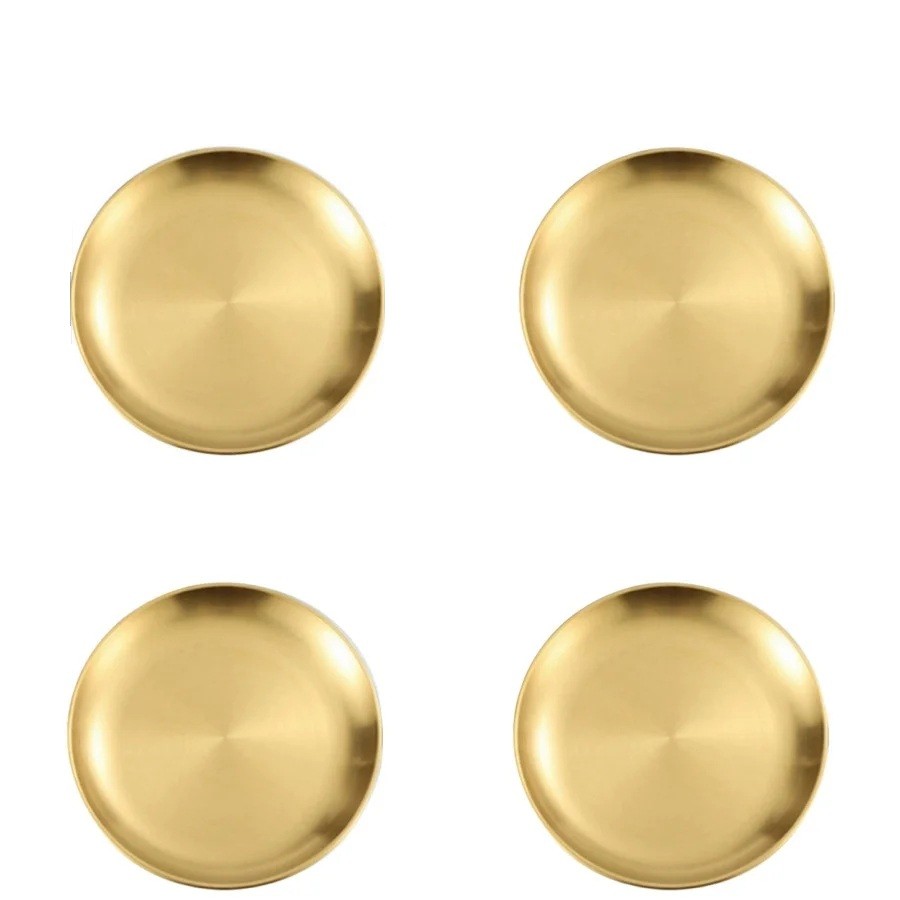 Die Teller sind aus Edelstahl gefertigt, was Festigkeit, Langlebigkeit und Widerstandsfähigkeit gewährleistet. Die glatte Oberfläche ermöglicht eine einfache Pflege und schnelle Reinigung. Die goldene Ausführung lässt sich leicht mit anderem Geschirr kombinieren. Die runde Form sorgt für Stabilität und eine bequeme Lagerung.