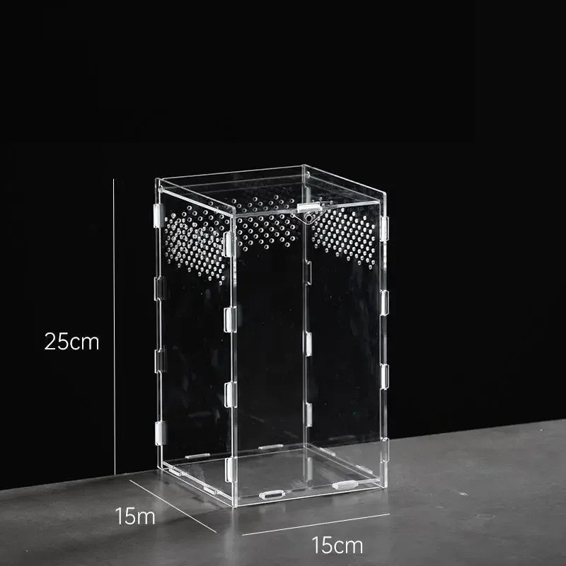 Dieses Acryl-Terrarium ist ideal für Reptilien, Taranteln, Spinnen, Skorpione und andere kleine Terrarientiere. Mit den Abmessungen 15 x 15 x 25 cm bietet es ausreichend Platz für Bewegung und Aktivität, was ideal für größere Reptilienbabys oder kleine Arten ist. Hergestellt aus hochwertigem Acryl, das maximale Transparenz gewährleistet, um die Tiere zu beobachten, ohne ihr natürliches Verhalten zu stören.