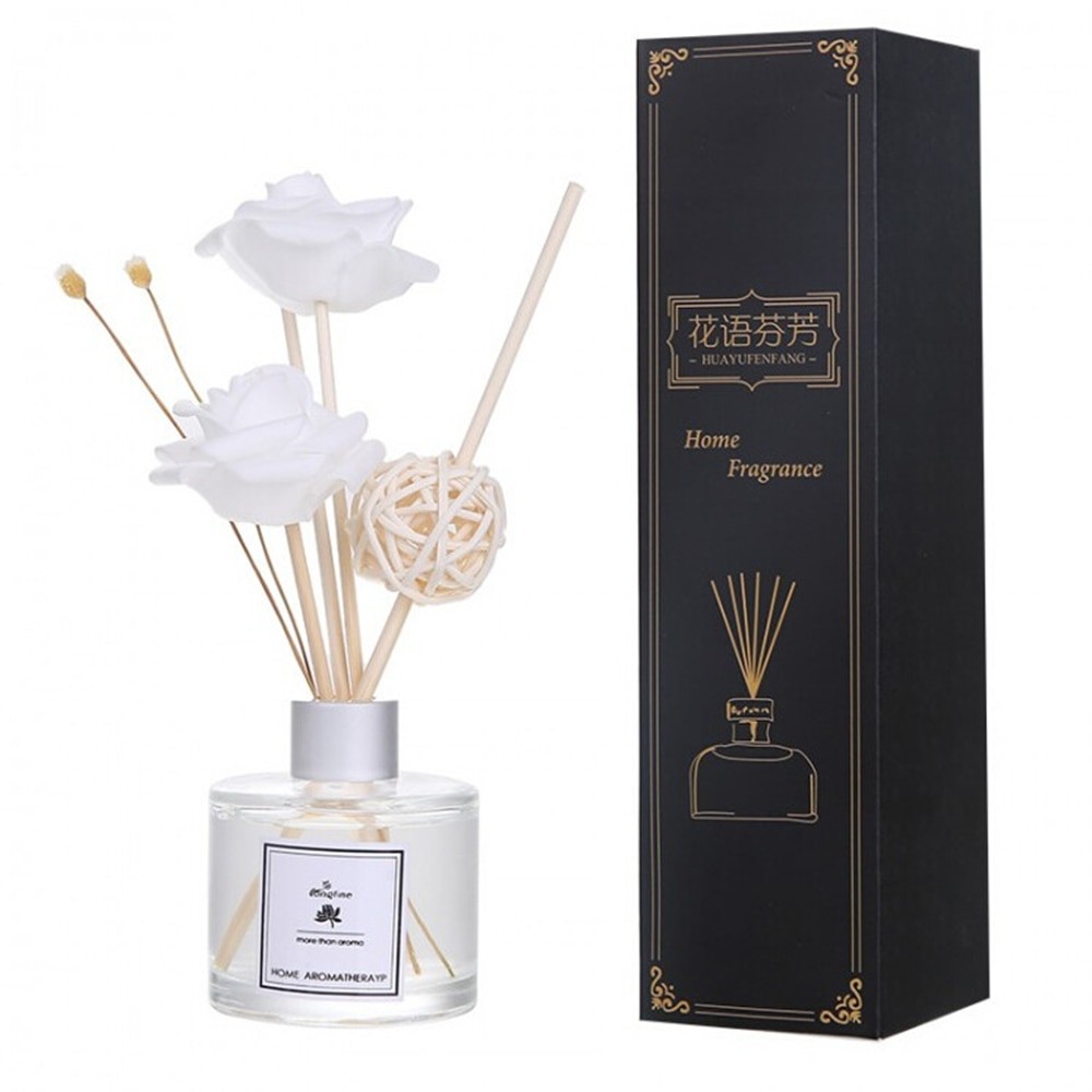 Packungsinhalt: 1x Ölflasche, 1x Rattankugel, 1x Duftblume, 2x Räucherstäbchen