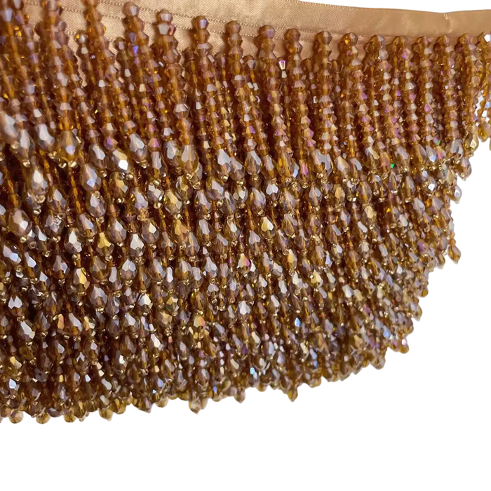 Das Hauptdesign-Element ist die bestickte Struktur ergänzt durch Perlenfransen, die dem Textil einen auffälligen und dekorativen Charakter verleiht. Die Fransen mit Perlen erzeugen einen sanften Bewegungseffekt und fügen dem Textil ein interessantes visuelles Detail hinzu. Die bestickte dekorative Borte kann somit ein markantes Element bei der Verschönerung von Vorhängen, Kissen oder dekorativen Überwürfen sein.