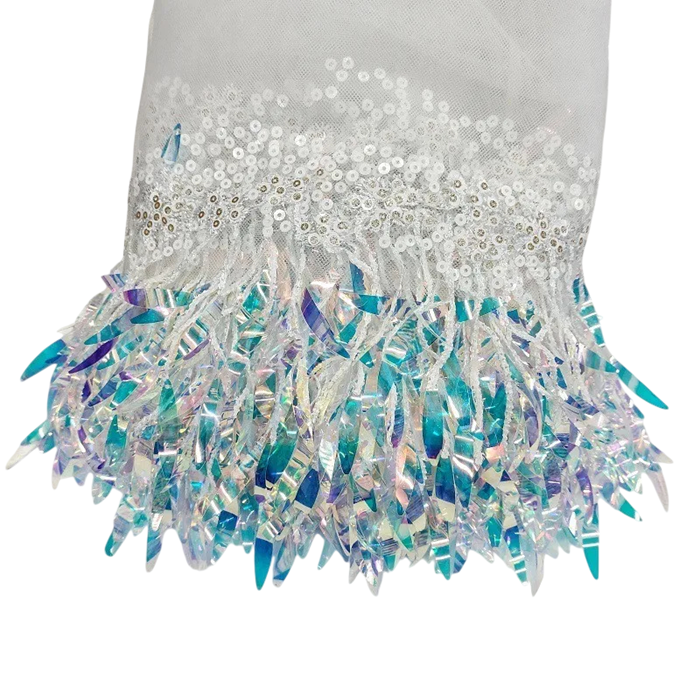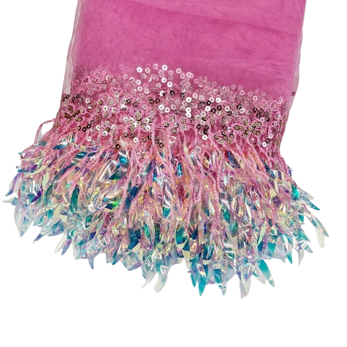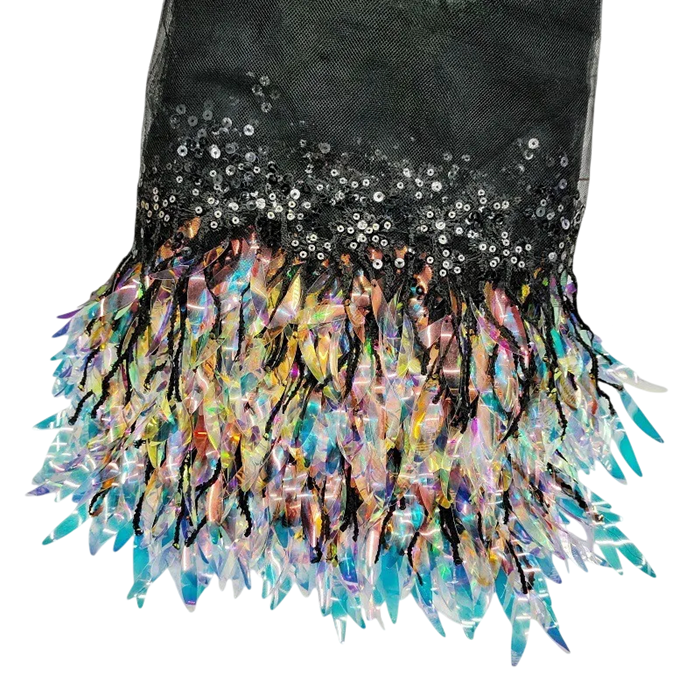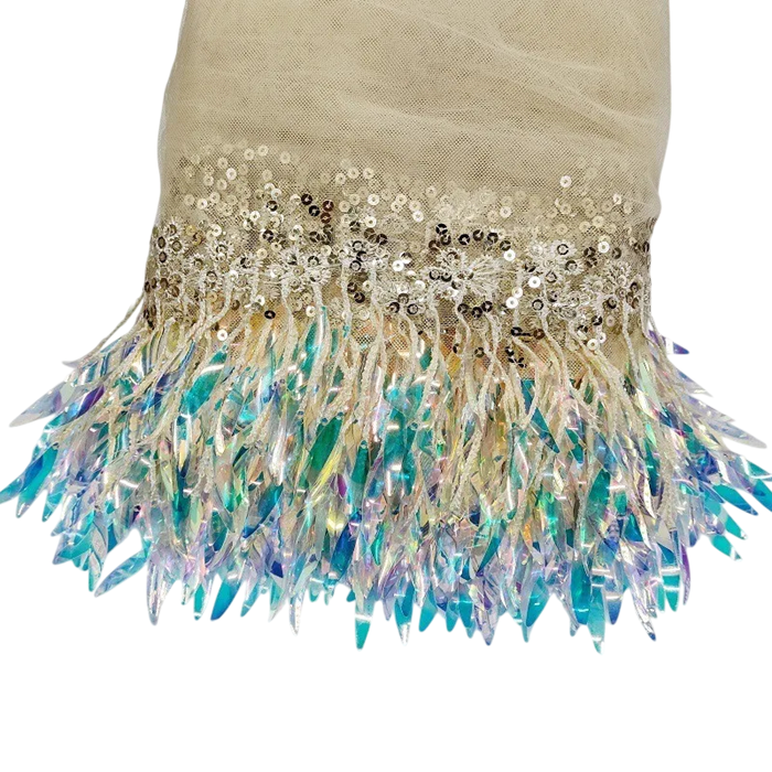 Dekoratives Netzband mit Blumenmuster, Pailletten und Fransen ist ein auffälliges textile Accessoire, das sich hervorragend zum Nähen, Verzieren von Bekleidungen und kreativen Projekten eignet. Die Kombination aus Netzstruktur, glitzernden Pailletten und beweglichen Fransen erzeugt einen attraktiven dekorativen Effekt, der sich hervorragend für Tanzkostüme, Bühnenkleidung oder stilvolle Dekorationen eignet. Mit den Abmessungen Breite 18 cm und Länge 182 cm bietet das Band ausreichend Material für größere Projekte und detaillierte Verzierung.