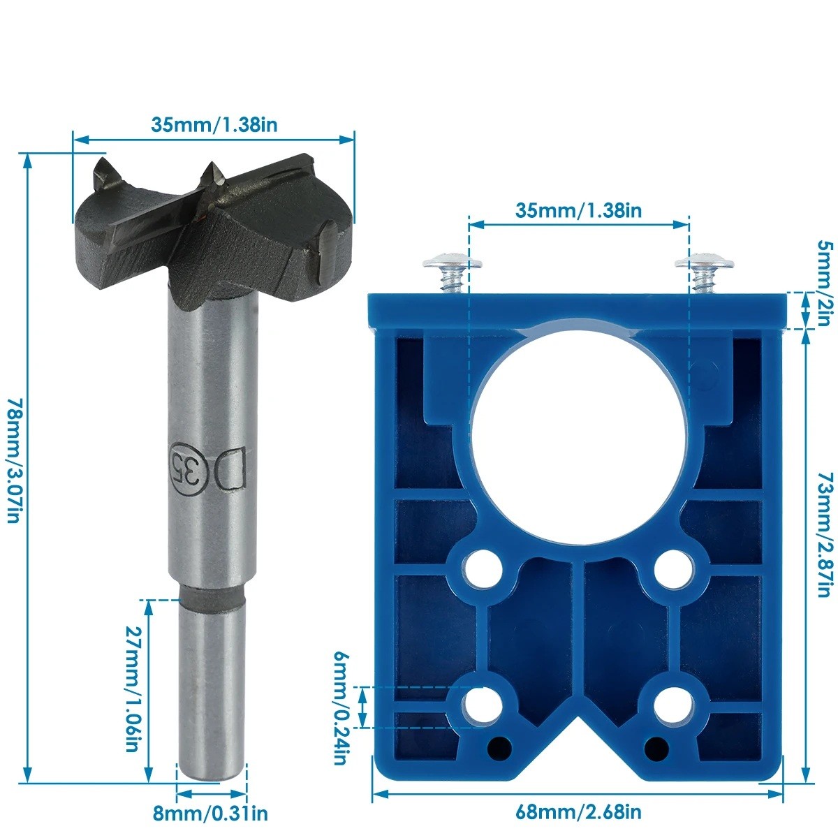 Dieses Bohrschablonenset ist für das präzise und sichere Bohren von Löchern für versteckte Möbelbeschläge mit einem Durchmesser von 35 mm vorgesehen. Es ist die ideale Wahl für die Montage von Küchentüren, Schränken, Kommoden und anderen Möbeln, bei denen hohe Präzision und ein sauberes Ergebnis ohne Materialausreißen erforderlich sind.
