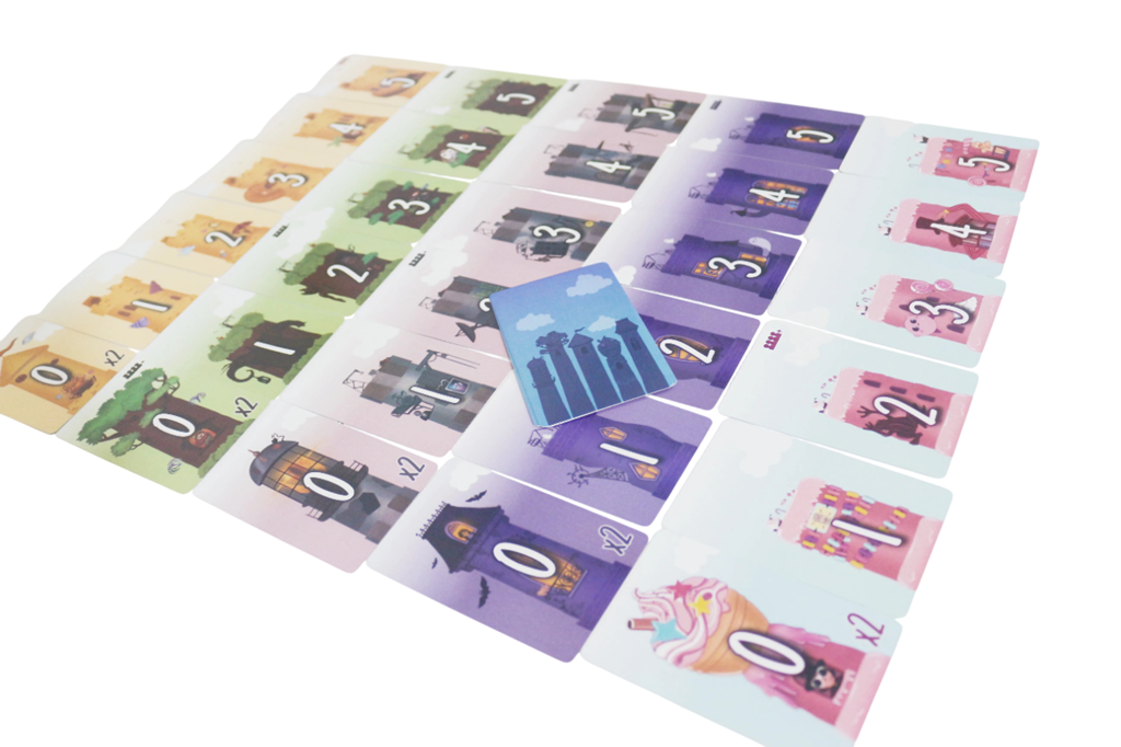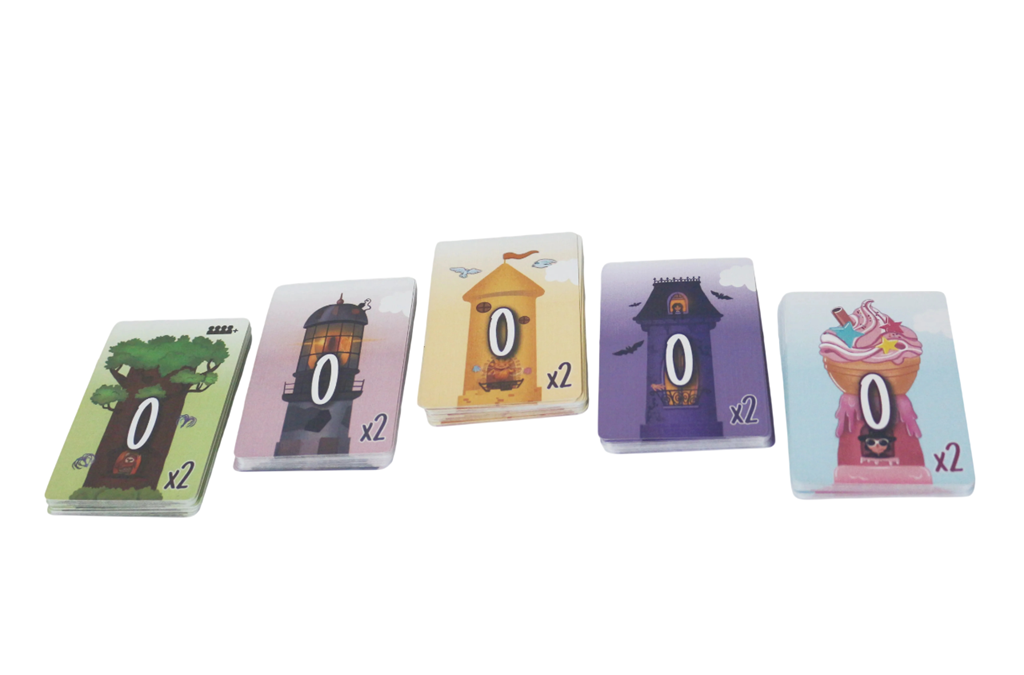 Unterhaltsames strategisches Brettspiel für 2-6 Spieler, bei dem Sie 5 Türme bauen und Punkte für Karten sammeln. Ideal für Kinder und Erwachsene mit niedlichen Details auf den Karten. Vollständige Beschreibung