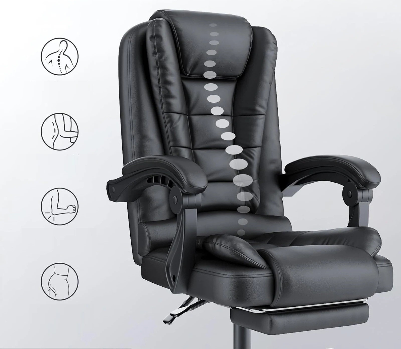 Dieser Bürostuhl ist so konzipiert, dass er während des Arbeitstags einen bequemen Sitz bietet. Der gepolsterte Sitz und die Rückenlehne sorgen für angenehmen Komfort und Unterstützung für Rücken und Arme. Der Stuhl ist mit einer höhenverstellbaren Sitzfläche und einer Fußstütze ausgestattet, die einfach herausgezogen werden kann für eine kurze Pause. Sitzfläche und Armlehnen sind mit Kunstleder bezogen, das leicht zu pflegen ist – regelmäßiges Abwischen mit einem feuchten Tuch und gelegentliche Imprägnierung sorgen dafür, dass das Material flexibel bleibt und nicht reißt. Der Stuhl ist um 360 ° drehbar und die Neigung der Rückenlehne kann zwischen 90 und 135 ° eingestellt werden für Arbeit, Entspannung oder eine kurze Pause.