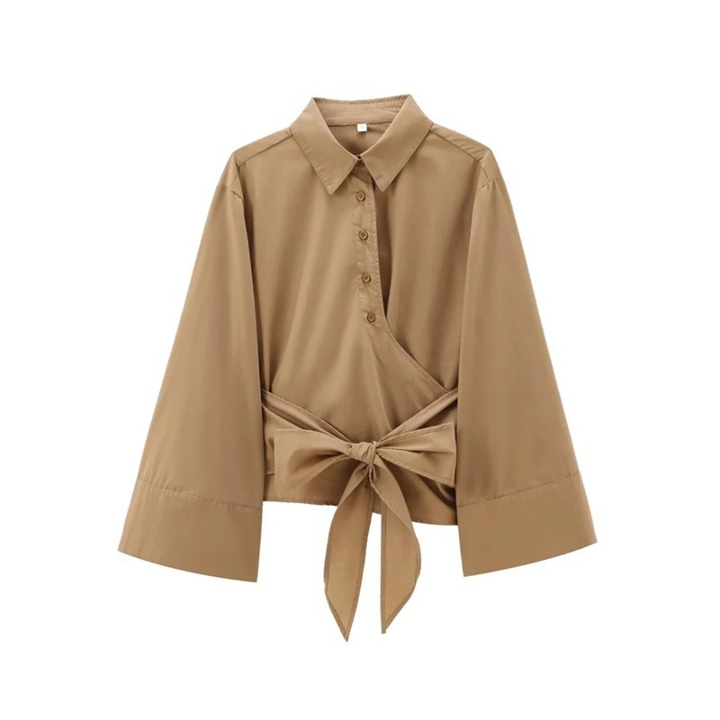 Startseite Startseite Kleidung und Accessoires Damenbekleidung Hemden für Damen Freizeithemden für Damen Damen elegante Bluse mit Kragen und langen Ärmeln Stilvolles Kimono mit Schleife in der Taille Einfarbige Bluse mit Knöpfen aus leichtem Polyester