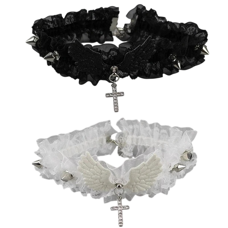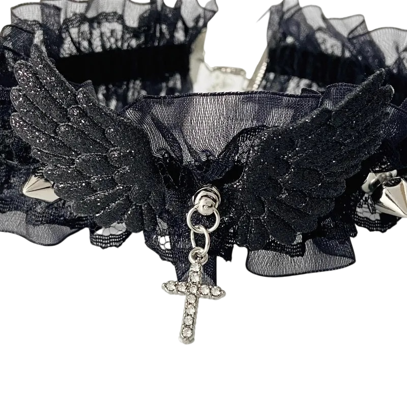Spitzen Choker mit dekorativen Flügeln, Nieten und Kreuzanhänger. Schließbare Halskette für stilvolle und gesellschaftliche Outfits. Vollständige Beschreibung