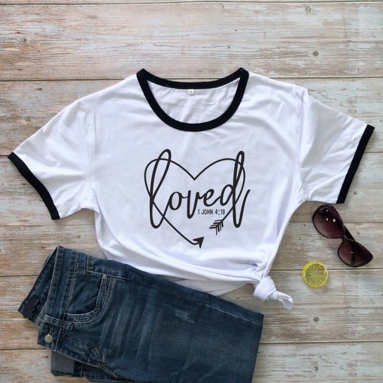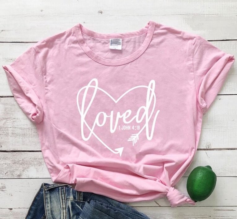 Damen-T-Shirt mit dem Aufdruck „Loved“.