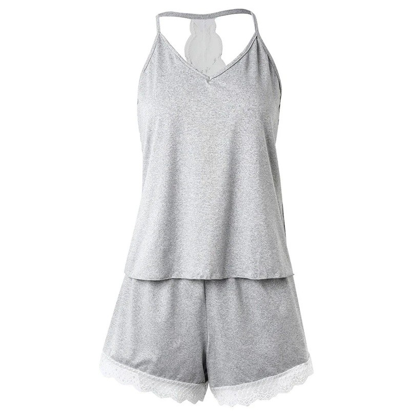Startseite Startseite Kleidung und Accessoires Damenbekleidung Nachtwäsche für Damen Pyjamas für Damen Damenpyjama mit Spitzenrand und Spitzenrücken Top mit V-Ausschnitt und Shorts Einfarbiger Set aus Polyester und Spandex Verschiedene Farben