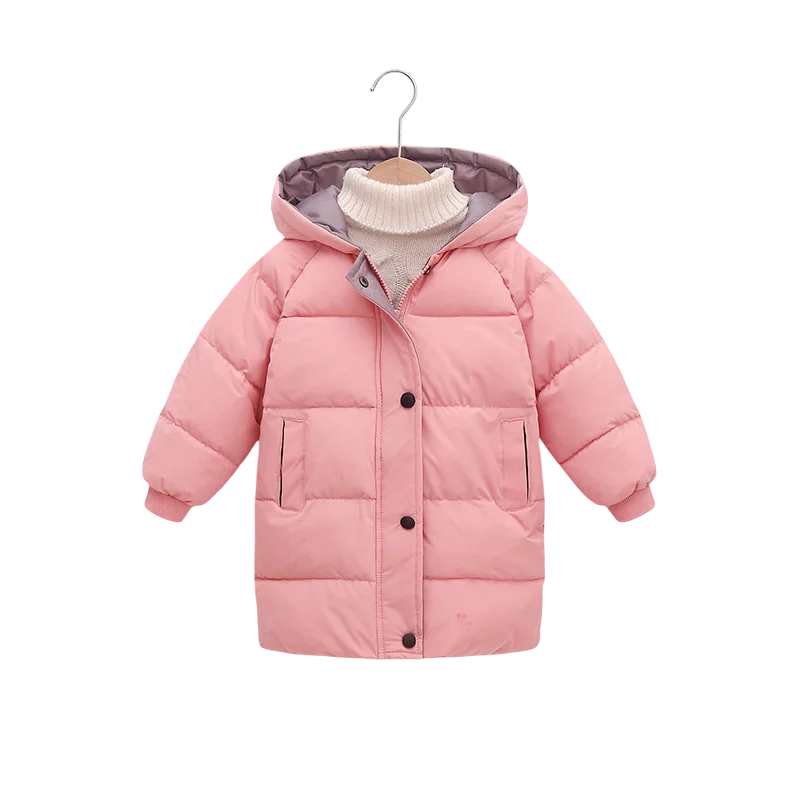 Startseite Startseite Kleidung und Accessoires Kinderkleidung Mädchenkleidung Jacken, Mäntel und Westen für Mädchen Winterjacken für Mädchen Einfärbige Kinderwinterjacke mit Kapuze Reißverschluss- und Druckknopfverschluss Taschen Warme Baumwoll-Polyesterjacke für Kinder Bequeme Winterjacke