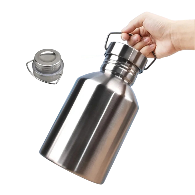 Praktische Edelstahlflasche mit einem Volumen von 2000 ml, großem Öffnungsbereich und Griff am Deckel. Geeignet für Wasser und Getränke beim Reisen und im Freien. Vollständige Beschreibung