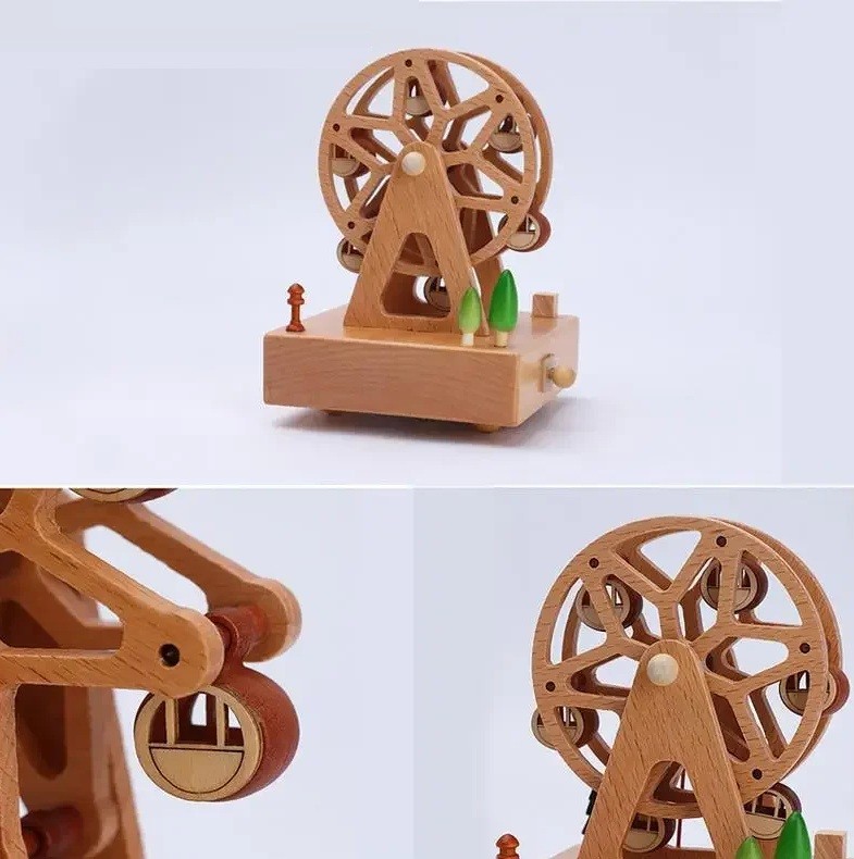 Am Rand des Rades sind kleine Gondeln angebracht, die so aufgehängt sind, dass sie beim Bewegen in stabiler Position bleiben. Dieses Detail verleiht der Spieluhr ein realistisches Aussehen und erhöht gleichzeitig ihre visuelle Attraktivität. Die gesamte Konstruktion ist auf einem stabilen Rahmen in Form eines Dreiecks befestigt.