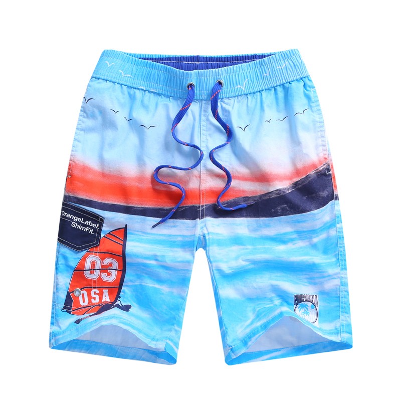 Schöne Strandshorts mit buntem Ozeanprint und einem Boot mit rotem Segel und der Nummer 03.