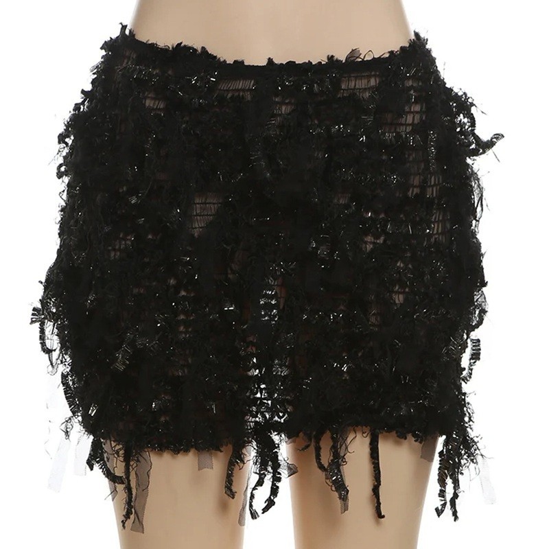 Kurzer transparenter Strickrock mit Quasten, sexy Miniröcke für Damen, schmaler Skinny-Rock für Strand und Partys, transparenter Sommerrock