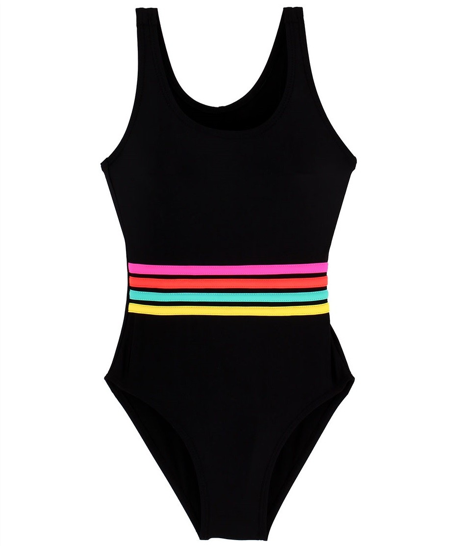 Schöne Mädchenbadebekleidung mit Loch am Rücken und Zierstreifen in der Taille.