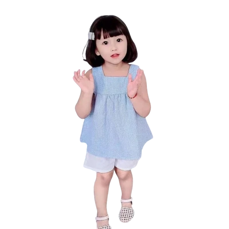 Startseite Startseite Kleidung und Accessoires Kinderkleidung Babykleidung Mädchenkleidung für die Kleinsten Baby Sets für Mädchen Mädchen Sommer Set Blaues Top mit breiten Trägern und weiße Shorts Raffung Rundhalsausschnitt mit Knopf