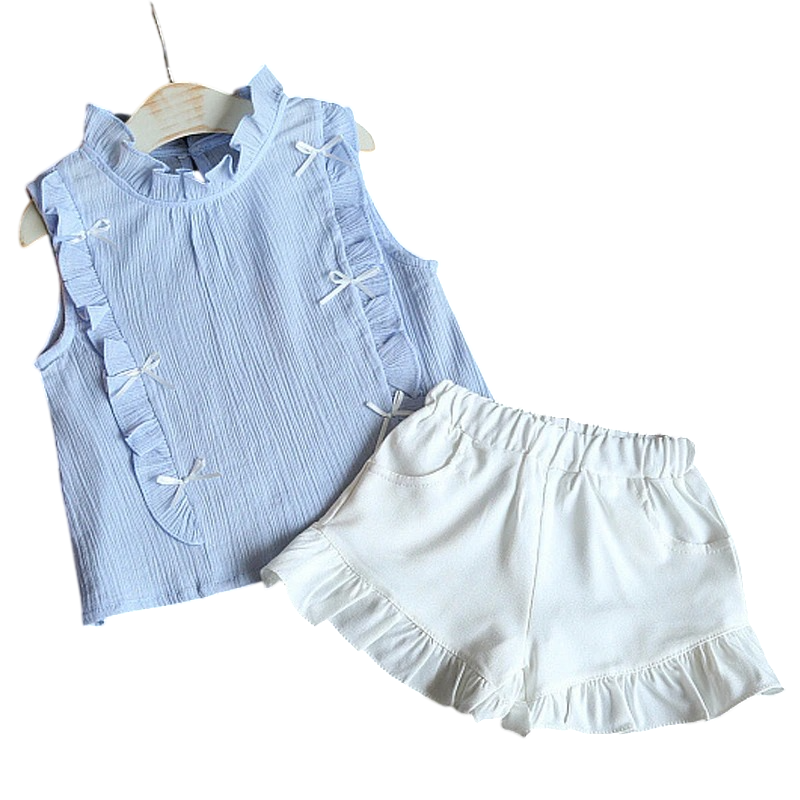Startseite Startseite Kleidung und Accessoires Kinderkleidung Babykleidung Mädchenkleidung für die Kleinsten Baby Sets für Mädchen Mädchen Sommer Set Einfarbiges Top mit breiten Trägern und weißen Shorts Raffung Schleifen Rundhalsausschnitt