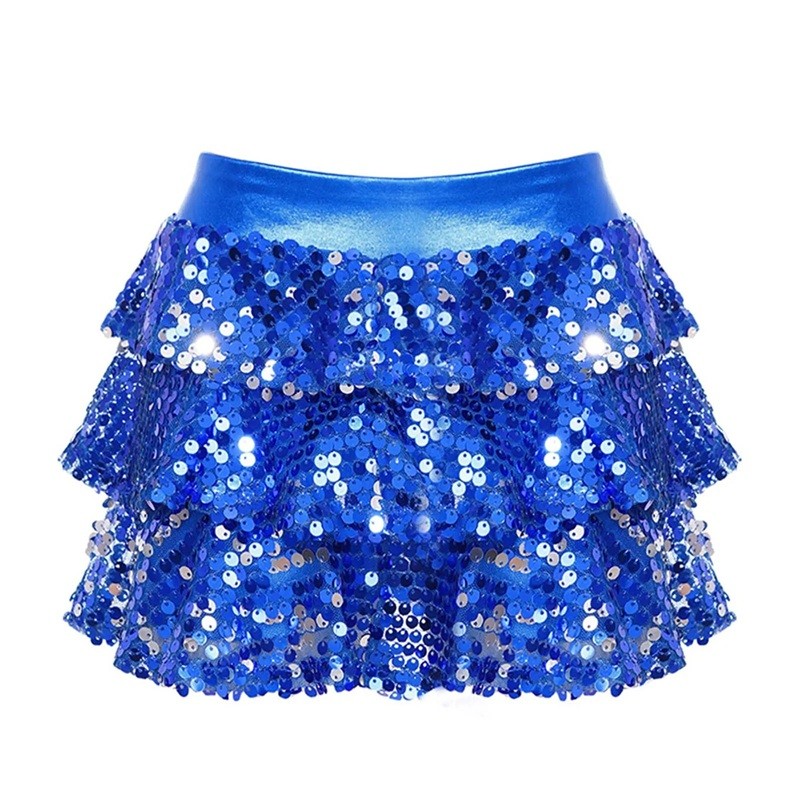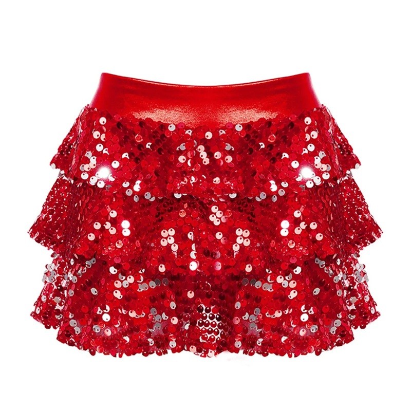 Glitzernder Rock mit Pailletten und Raffung, Länge über dem Knie, leichter Polyester geeignet für Feiern und Auftritte. Vollständige Beschreibung