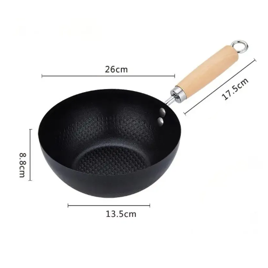 Hohe Stahlpfanne 26 cm ohne Finish, geriffelte Innenseite, Holzgriff, ideal für Gas. Vollständige Beschreibung