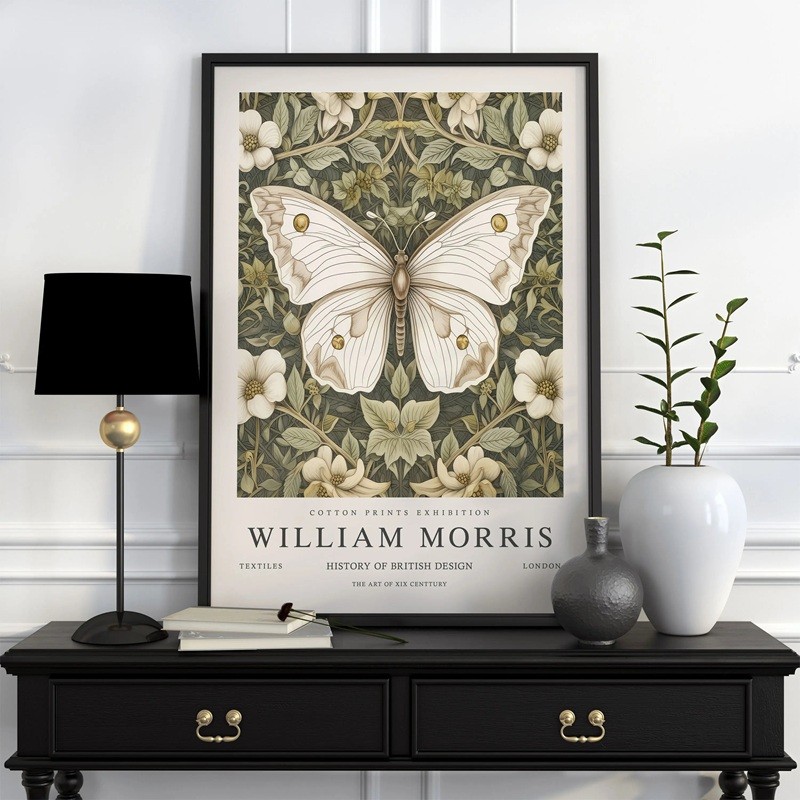Plakat William Morris mit Schmetterling und Blumenmuster 50x70 cm Polyesterleinwand beige-grünes dekoratives Wandbild