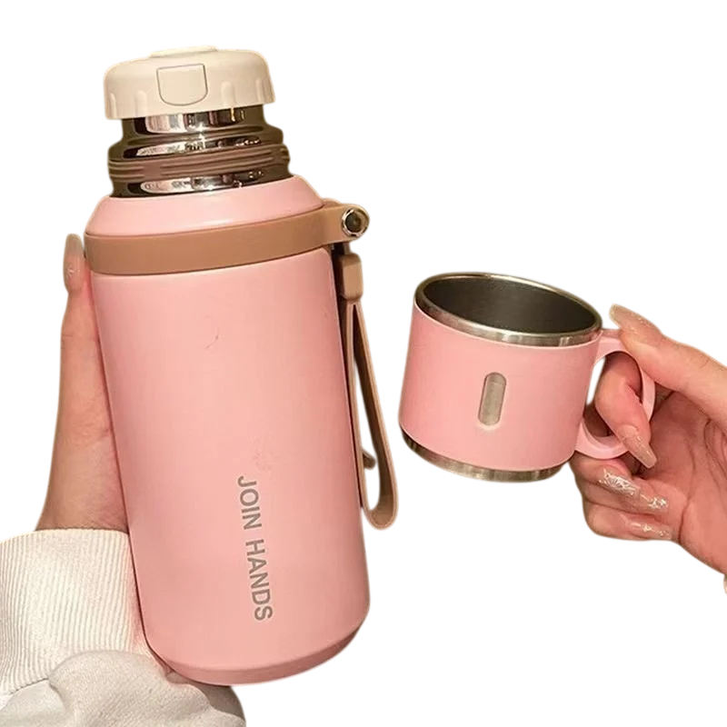 Ein integriertes Teesieb gehört zur Thermoskanne, das die Zubereitung von losem Tee direkt im Behälter ermöglicht. Der Deckel kann auch als Trinkbecher verwendet werden, sodass kein zusätzliches Geschirr mitgenommen werden muss. Die Thermoskanne verfügt über ein tragbares Design mit Griff, das das einfache Tragen beim Reisen oder im Alltag ermöglicht.