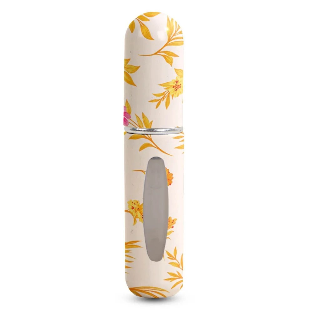 Reiseparfümatizer mit Sprühkopf 5 ml nachfüllbarer kompakter Flakon mit Fenster beige mit gelbem Blumenmotiv für die Handtasche
