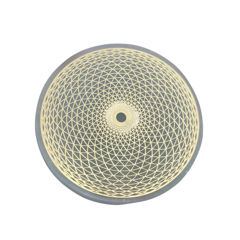 Der Selenitdisk mit Liebesmotiv ist ein dekorativer Gegenstand aus natürlichem Stein, der durch seine detaillierte Verarbeitung besticht. Die Oberfläche des Diskes hat weiße Färbung, ergänzt durch ein feines goldenes geometrisches Muster, das über die gesamte Fläche sichtbar ist. Dieses Motiv schafft eine regelmäßige Struktur und verleiht dem Disk einen markanten Look.