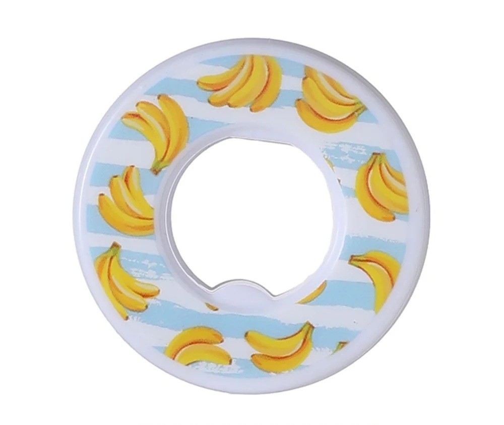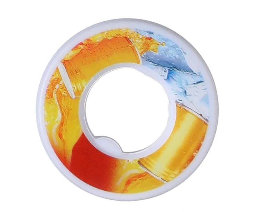 Die Ringe haben eine runde Form mit einem Loch in der Mitte. Auf der Oberseite befindet sich ein Druck mit dem Motiv des jeweiligen Geschmacks, der auch nach der Installation im Flaschenverschluss sichtbar ist. Das Produkt besteht aus Kunststoff und ist als Zubehör für Kunststoff-Sportflaschen zum Trinken gedacht.