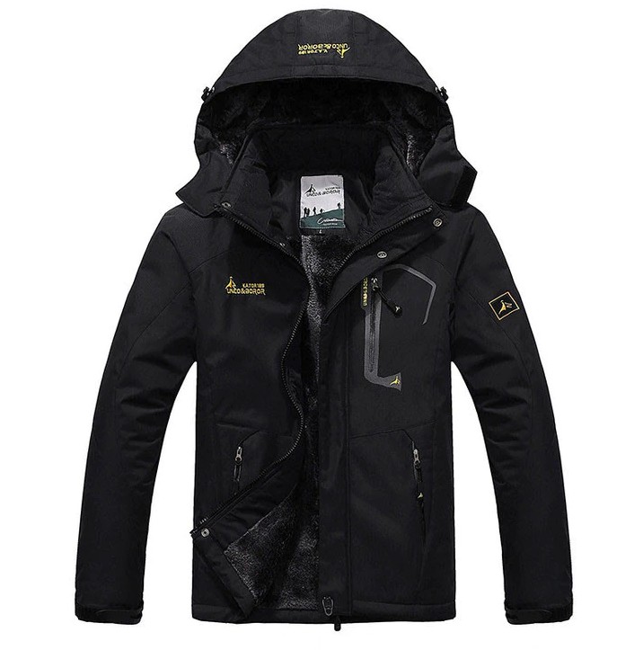 Die Jacke ist außen wasserdicht und innen hält weiche Baumwolle warm.