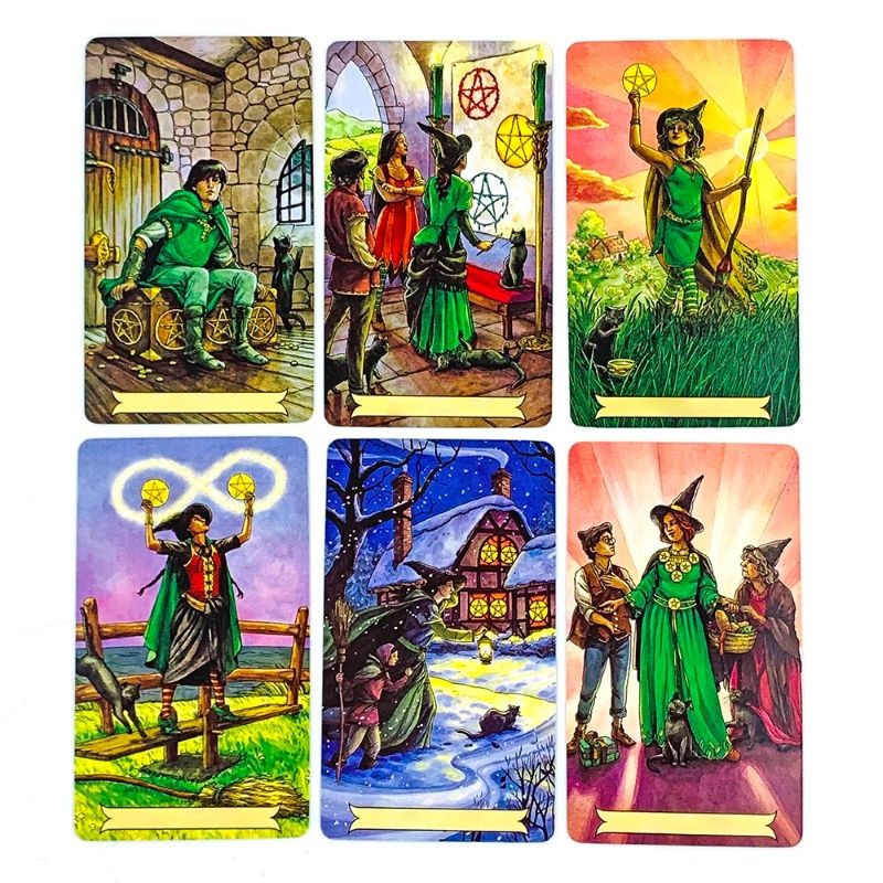 Die Illustrationen auf den Karten sind auffällig farbenfroh und zeigen verschiedene Szenen – zum Beispiel Figuren in historischer Kleidung, Innenräume, Außenumgebungen oder symbolische Situationen. Auf einigen Karten sind auch tierische Motive und magische Elemente sichtbar, die die Gesamtatmosphäre ergänzen. Dieser visuelle Stil unterstützt die Orientierung bei der Deutung und erleichtert die Arbeit mit den Karten.