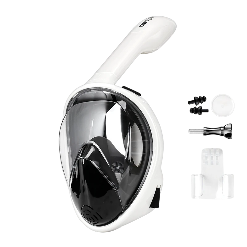 Ein spezielles Luftventil mit Kugel verhindert das Eindringen von Wasser beim Eintauchen und sorgt somit für maximale Sicherheit beim Schnorcheln. Die Maske enthält außerdem eine praktische Stirnhalterung, an der Sie einfach eine Actionkamera befestigen können, um einzigartige Erlebnisse aus der Unterwasserwelt festzuhalten. Im Paket finden Sie zudem Ohrstöpsel, die Schutz vor dem Eindringen von Wasser bieten.