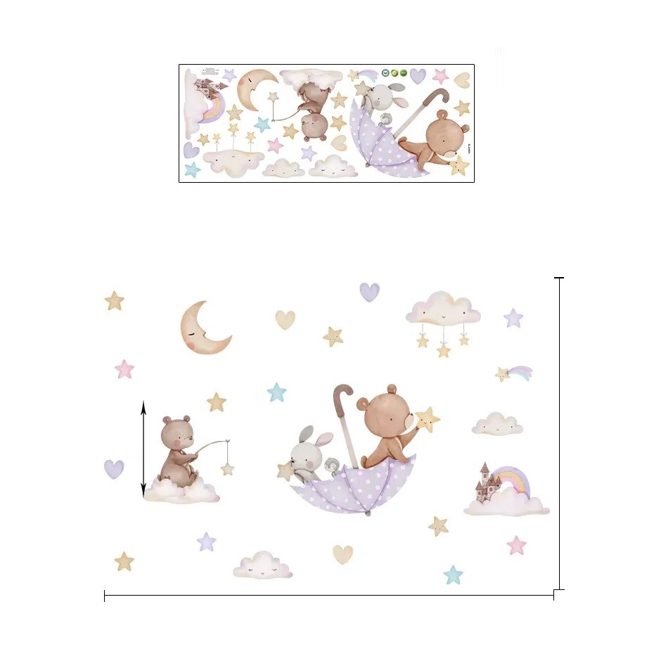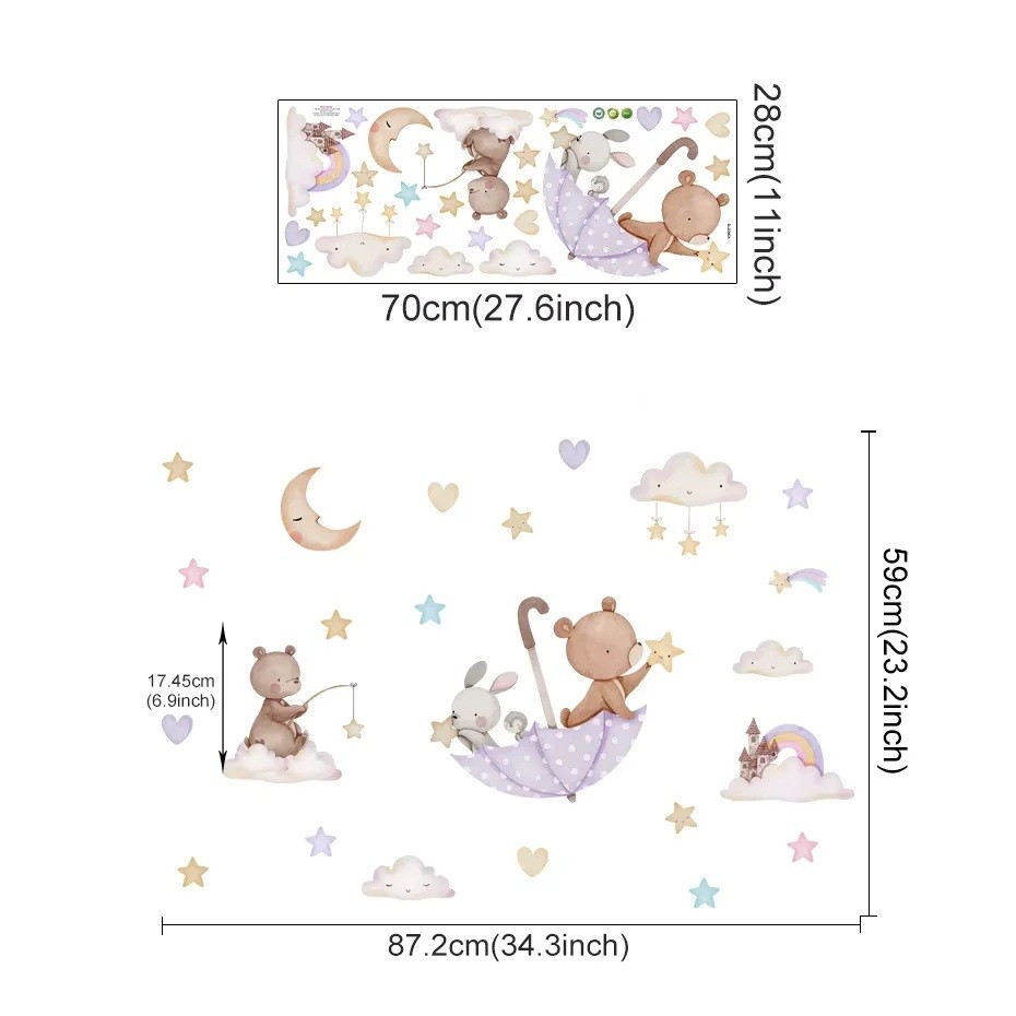 Wandaufkleber 87,2 x 59 cm Bär mit Hase im Regenschirm Transparente Kinderzimmer Wanddekoration aus mattem Vinyl Zarte niedliche Raumdekoration