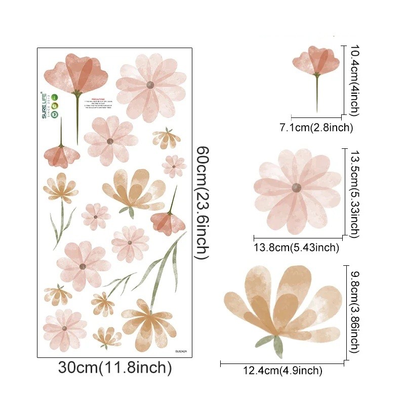 Die Blumen-Wandsticker in der Größe 60 x 30 cm bieten eine elegante und natürliche Möglichkeit, jeden Innenraum aufzufrischen, ohne komplizierte Installationen oder aufwendige Anpassungen. Das zarte Blumendesign verleiht dem Raum Leichtigkeit, Harmonie und ein frisches Aussehen. Dank des verwendeten transparenten matten Vinyls, das sich schön mit dem Untergrund verbindet, wirkt die Dekoration sehr natürlich und eindrucksvoll, als wäre sie direkt an die Wand gemalt. Das Vinylmaterial bietet zudem hohe Widerstandsfähigkeit, Flexibilität und eine lange Lebensdauer.