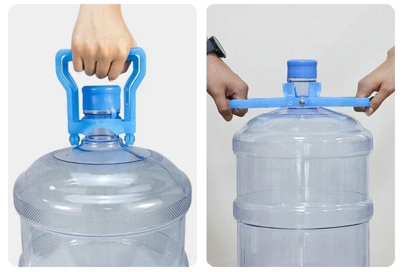 Auf den Fotos ist die Verwendung des Tragegriffs beim Anheben einer großen Wasserflasche zu sehen. Der Griff ist so gestaltet, dass er in der Hand gehalten werden kann und das Tragen ohne direktes Greifen des Fasses ermöglicht.